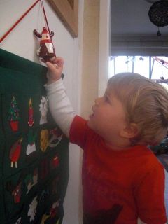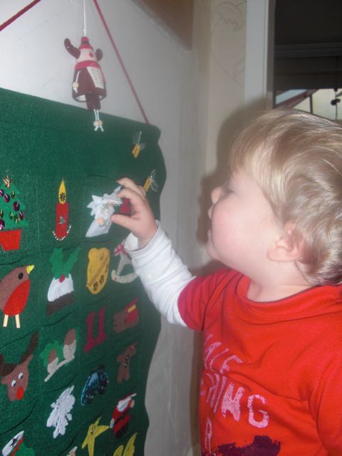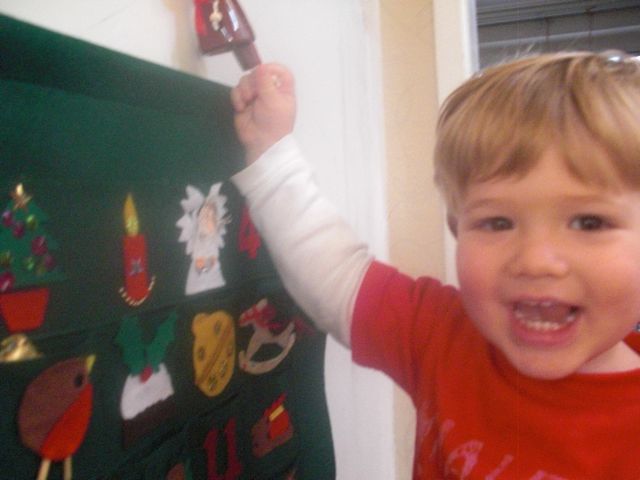 Hétvégén felkerültek a lakásba a karácsonyi díszek, felraktuk Benji tavaly készített adventi naptárát is. Idén sokkal jobban értékelte, mint tavaly. Amikor felébredt a délutáni alvásból és jött le a lépcsőn rögtön észrevette a falon és nagy “óóóó”-val rá is csodálkozott. Belerejtettünk a 3-as szám alá egy kis csoki macit, amit kivett, megnézett, kezembe nyomott, majd visszanyúlt a zsebbe, hátha van még ott valami. Miután semmit nem talált, bekukucskált még egy-kettőbe, hátha van ott is valami, majd rámnézett, felhúzta a kis vállait, és megállapította, hogy “gone”, miszerint, eltűnt, elfogyott (illetve mindenre ezt használja ami nincs többé, elment, stb).