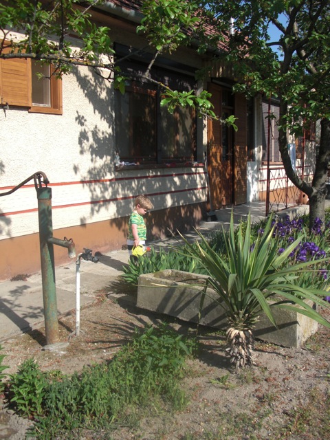És gyorsan ki kellett használni a jóidőt egy kis pancsoláshoz. Sajnos felfújható medencénk itt nincs, mert rövid és kiszámíthatatlan mikor van jó idő. Így kicsit rögtönöztem, elővettem a babakádat,megtöltöttük vízzel, és abban lehetett pancsizni. Illetve lehetett volna ha nem fél szokásosan a víztől, így inkább kintről pancsolt, néha beleállt, majd elkezdte locsolgatni a lábam (jelenlegi felduzzadt állapotában mennyei volt a bokámnak a hideg víz), majd a virágokat sorban (mindegyik után megdícsérte magát, hogy “good boy”, majd szólt, hogy “még bíz (víz)”, én meg hordhattam a konyhából két literes üvegben a vizet. (abszolút nem környezetbarát és víztakarékos megoldás belátom…)