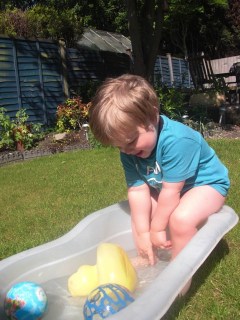 És gyorsan ki kellett használni a jóidőt egy kis pancsoláshoz. Sajnos felfújható medencénk itt nincs, mert rövid és kiszámíthatatlan mikor van jó idő. Így kicsit rögtönöztem, elővettem a babakádat,megtöltöttük vízzel, és abban lehetett pancsizni. Illetve lehetett volna ha nem fél szokásosan a víztől, így inkább kintről pancsolt, néha beleállt, majd elkezdte locsolgatni a lábam (jelenlegi felduzzadt állapotában mennyei volt a bokámnak a hideg víz), majd a virágokat sorban (mindegyik után megdícsérte magát, hogy “good boy”, majd szólt, hogy “még bíz (víz)”, én meg hordhattam a konyhából két literes üvegben a vizet. (abszolút nem környezetbarát és víztakarékos megoldás belátom…)