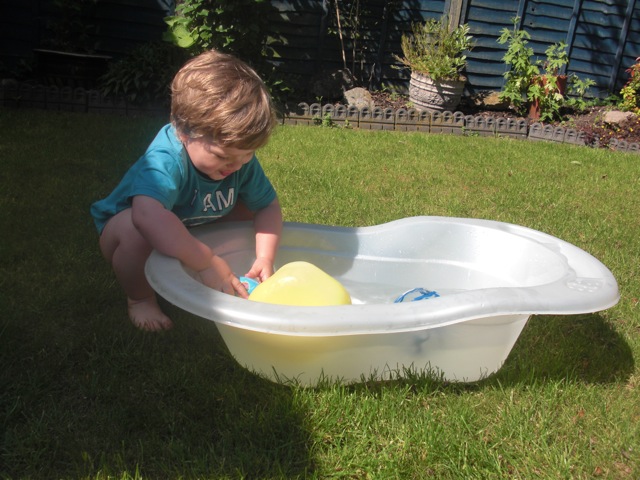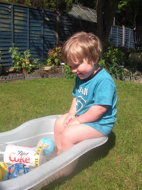És gyorsan ki kellett használni a jóidőt egy kis pancsoláshoz. Sajnos felfújható medencénk itt nincs, mert rövid és kiszámíthatatlan mikor van jó idő. Így kicsit rögtönöztem, elővettem a babakádat,megtöltöttük vízzel, és abban lehetett pancsizni. Illetve lehetett volna ha nem fél szokásosan a víztől, így inkább kintről pancsolt, néha beleállt, majd elkezdte locsolgatni a lábam (jelenlegi felduzzadt állapotában mennyei volt a bokámnak a hideg víz), majd a virágokat sorban (mindegyik után megdícsérte magát, hogy “good boy”, majd szólt, hogy “még bíz (víz)”, én meg hordhattam a konyhából két literes üvegben a vizet. (abszolút nem környezetbarát és víztakarékos megoldás belátom…)