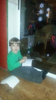 Karácsony közeledtével elkezdtük kidekorálni a lakást, és kis pedánsom lelkesen segédkezett. Nagyon élvezte, hogy hópehely matricákat ragasztunk az ablakra, bár a “rend a lelke mindennek” természetét zavarhatta a szép kuszaságban leeső hópelyhek és persze át kellett őket rendezni sorba. Így történt, hogy Lakeréknél függőleges vonalban esik a hó…(azóta is, mert ahányszor titkon este átrendezem, ő jön reggel és újra sorba rendezi őket).