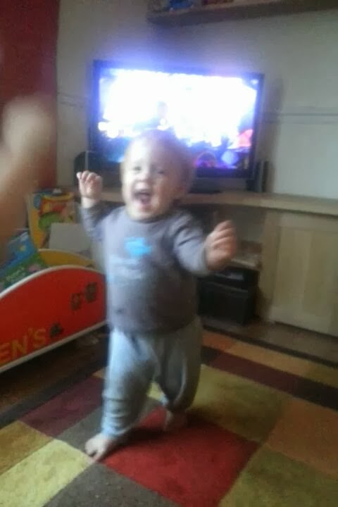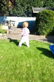 Szerdán tette meg az első lépéseket. Tipikus Robinosan, nem ám óvatosan, fél kézzel kapaszkodva, lassan-lassan próbálkozva, mint Benji tette. Nem. Robin fogja magát, vesz egy nagy levegőt, majd uccu neki, 5-6 kis gyors lépés vigyorogva, majd puff, arccal előre bele a földbe. (mivel a kezét nem tanulta még maga elé tenni, így persze orra, homlokra, mit mikor ér. De amint bevágódott, felpillant, ránk néz és ránk vigyorog. Muszáj megtapsolni. Majd az egyre pirosodó homlokát szétpuszilni.
