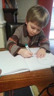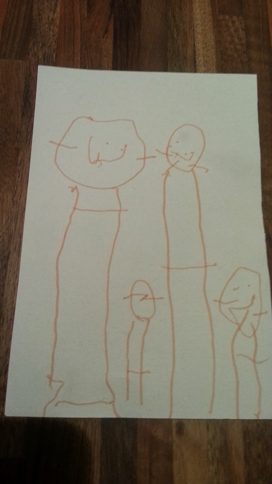 Benjivel is büszkélkedem egy kicsit: megrajzolta élete első igazán felismerhető rajzát! És pont a kis családunkról: