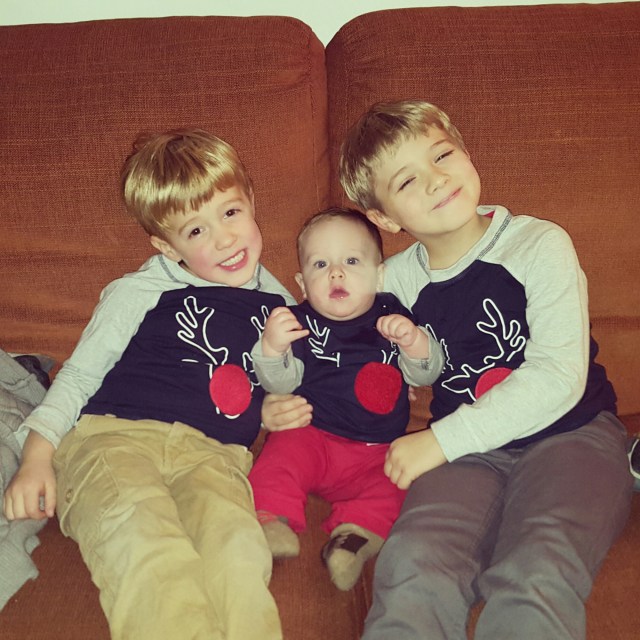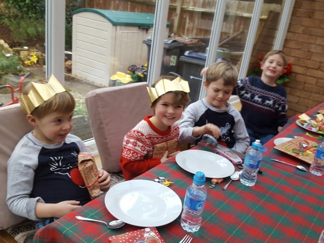 A karácsony az építkezés miatt nagyon sietős lett, szerettem volna megélni az adventet, a gyerekekkel rákészülni, mézeskalácsot sütni, hamarabb fát állítani, csinálni egy-két ajándékot, karácsonyi zenét hallgatni és forró csokizni a fiúkkal. De a munkások és egy 5 hónapos miatt ebből nem lett semmi. Éppen hogy felállítottuk a fát 24-én, nem volt semmi dekor vagy mézeskalács illat, de a gyerekek így is élvezték. Még mindig megélik a csodát, és igaz, hogy nem Jézuskát hanem Santát várnak de totál hisznek benne, kitették a kekszet meg répát neki, és 24-én este nem az angyalok csengettyűjét vártuk, hanem a Santáét. Szokás szerint fent készülődtünk fürdés után, míg lent Richard bepakolta az ajándékokat a fa alá (amit majdnem észre vettek, mert az ablakukból fent lesték, hogy látják-e Santát jönni, de elfelejtettem, hogy az új nappalin tető ablak van és Benji egyszer csak megszólalt, hogy “látom Daddyt!”. Majdnem észrevette,hogy csempészi az ajándékokat a fa alá. Lehet ez volt az utolsó év, hogy még teljes szívből ártatlanul hisz a csodában, pedig de jó lenne, ha mindig így maradna!
