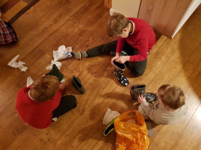 Ehhez képest most 23-án este pötyögöm ezt pedig még a gyerekeknek nincs is minden ajándék össze készítve. Holnap délelőtt csinálunk majd karácsonyi gyömbéres kekszet (ha már mézeskalácsot nem is…), ma délután sikerült végre leülni és megfesteni azokat a fehér díszeket (nagyon élvezték a fiúk), forró csokizás elnapolva, a Lidl-es koszorút ki kellett dobni, mert megszáradt a radiátor mellett míg én vártam a megfelelő alkalmat, hogy feldíszítsem. A karácsonyi lapokat amiket angol szokás szerint meg kellett volna már 2 hete írni és elküldeni szomszédnak, családnak, postásnak, tanárnak, barátnak, nem írtam meg. Helyette ma küldtem szégyen szemre üzenetet a facebookon, hogy bocsi de idén csak erre volt időm. (Nem is értem miért én aggódom ezen, amikor a Richard családjáról és angol szokásról van szó…)