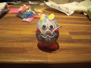 Megszáradt, lelakkoztuk, és kis szemet meg fület ragasztottunk rá, és kész is lett a szép tarka tojás nyuszi.