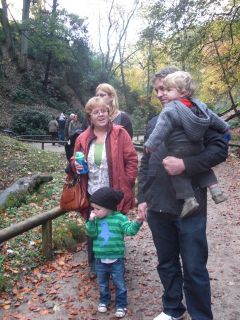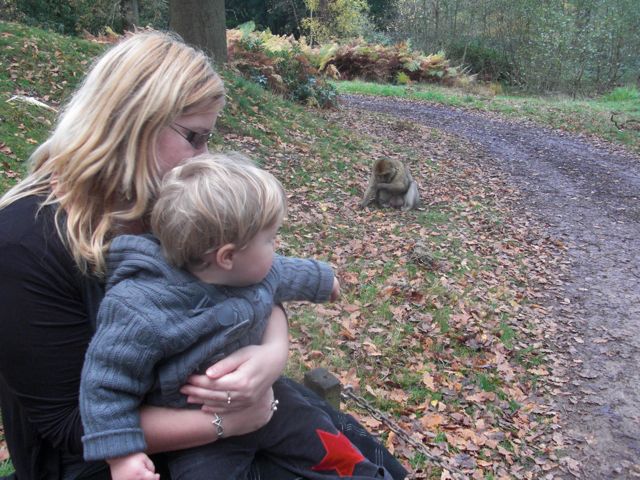 Szombaton a búcsúnapon pedig Trentham-be mentünk, ahol van egy majom erdő. Lekerítettek egy erdőrészt és oda majmokat telepítettek be, egy kis ösvényen lehet körbe kirándulni úgy, hogy a makik ott császkálnak körülöttünk. Benji teljes eksztázisba esett amikor meglátta őket (mostanában nagyon élethű maki makogást tud kiadni ha könyvben vagy tv-ben meglát egy majmot, rögtön mondja, hogy “uh uh uh”. Mondjuk elég kínos, hogy ezt a hangot adta ki amikor egyik újságban egy fekete DJ-re mutatott…). Körbe-körbe szaladgált, és dupla kövér ujjakkal mutatott a majmokra, hogy “uh uh uh”, szaladgált, rugdosta az avart…nagyon élvezte. Mondanom sem kell, hogy aznap este nem nagyon kellett altatni…