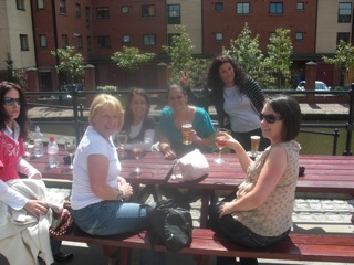Szombaton pedig felkerekedtünk, mert közös Marina barátnőnket elbúcsúztattuk lányságától :-)) 7 fős kis csapat utazott Manchesterbe a hétvégére. Annak ellenére, hogy a legesősebb város Angliában nagyon jó időt fogtunk ki így a vonat utat egy napos folyó parti bárban vezettük le egy kis borral. Majd besétáltunk a városba (ami meg kell hagyni szebb, mint Birmingham), bekukkantottunk egy szabadtéri jazz fesztiválra, shoppingoltunk (iszonyú nagy bevásárló kerülete van, kár, hogy csak ma hétfőn kaptam fizut, de legalább spóroltam :-)), vacsiztunk egy szuper Tapas bárban, majd irány vissza a hotel, készülődés és vissza a város, hogy elfoglaljuk a befoglalt helyünket a Birdcage bárban. Cabaret-nak, transzvesztita shownak, dizőz fellépőkkel volt meghírdetve, szóval pont szuperul hangzott egy lánybúcsúhoz, na de hát a show műsor hagyott némi kivetni valót maga után. Ha esetleg valaki erre a blogra tévedne és tervezné Manchesterben meglátogatni a Birdcage nevezetű helyet ne tegye csak a show miatt mert elég gagyi volt. Hacsak nem férfi az illető és nőt akar felcsípni mert abból volt bőven (kb 95%) csak úgy repkedtek a csajok (lehet ezért Birdcage a hely neve?!). A hely jó volt és nagyon jó volt a zene így kihoztuk a legtöbbet belőle és kitáncoltuk magunk (legalább is én biztos aki már 2 éve nem volt bulizni) de azért még átnéztünk a Hard Rock caféba is levezetésképp 😉