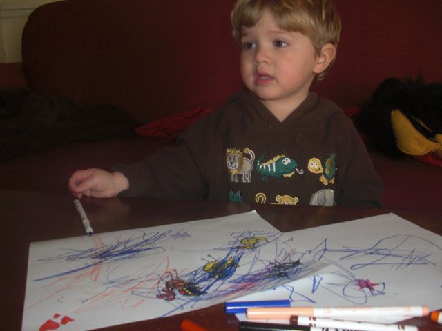 Itthon meg rajzolgat mostanában, és szerencse, hogy a filc amit karácsonyra kapott kisbarátjától vízzel kimosható,mert sikerült szép csíkot húznia a sötét kékkel a réz színű ülőgarnitútánkra… :-))
