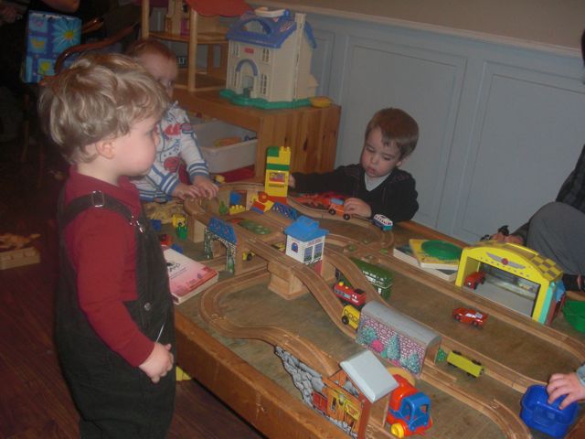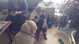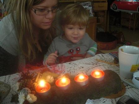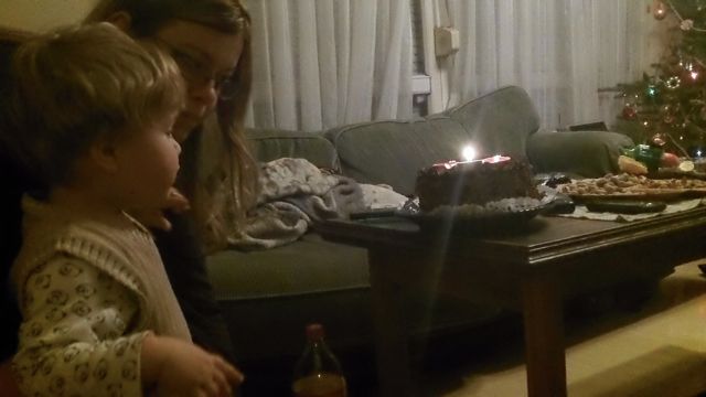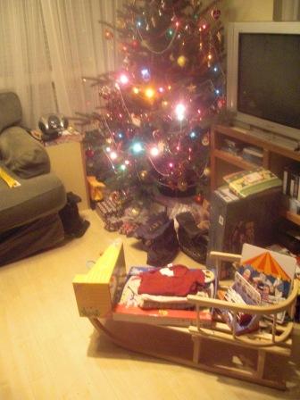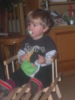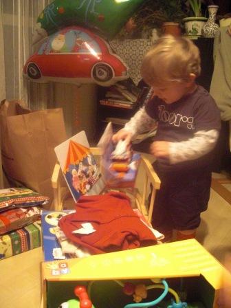 Benji idén nagyra értékelte a fát (ami idén Apu és Richard díszítését dicséri), lejött délutáni alvásból és szimplán annyit szólt, hogy “wow”. Jobban megvolt illetődve, amikor este csengettek az angyalok, le volt oltva a lámpa, égtek a csillagszórók, szólt a Mennyből az angyal….tátva maradt a szája. Persze az ajándékait rögtön kiszúrta, a szánkót el kellett magyarázni, hogy mi is, és azt hiszem még el is kell majd ha lesz hó, mert egyenlőre azt hiszi, hogy az az ő kisszéke, és onnan lehet nézni az eseményeket…