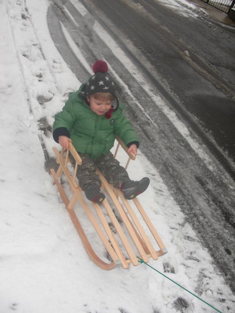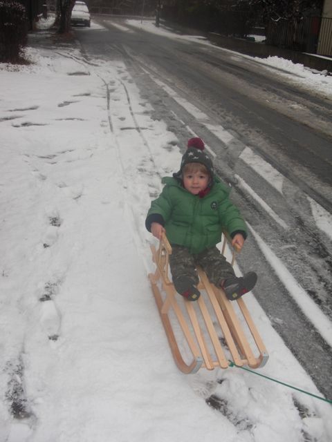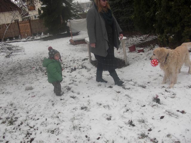 Utolsó nap kegyes volt a sors, mert leesett egy kis hó, és kb 2 órán keresztül meg is maradt, így gyorsan kipróbálhattuk és megmutathattuk Benjinek milyen is a szánkózás. Egy darabig húzatta magát, de utána jobban érdekelte a latyakban tapicskolás.