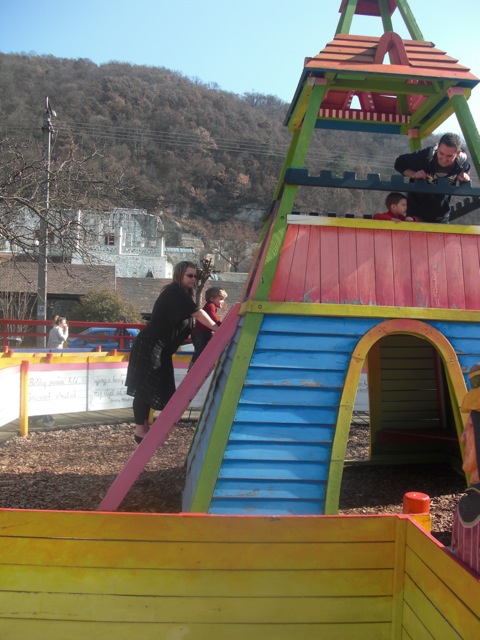 És a fából faragott játszótér is. Dinával igyekszik fel a várba