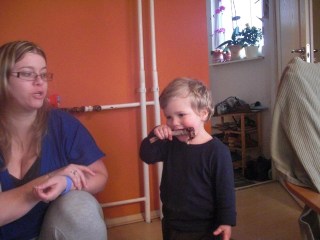 Ő csuda aranyos volt amikor beléptünk röhögve szaladt elénk, hogy “Mami, Daddy” mi meg szétpuszilgattuk a gömbölyded testrészeit. Jayne azt mondta, hogy jó volt, aludt, evett rendesen, nem volt vele gond. Nekünk se duzzogott, amitől féltem így otthon jött is neki a nyuszi. Hozott csirke csokikat, és egy tök jó mágneses játékot (Vannes-ból) ahol állatok fejeit kell összepárosítani a lábukkal. Hát sajnos nem nagyon érdekelt még, de remélem lassan rájön az ízére,  mert ha nem kénytelen leszek én kirakni őket!