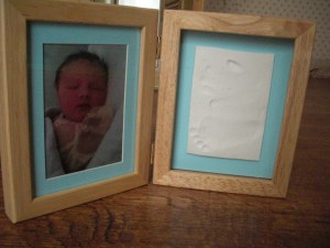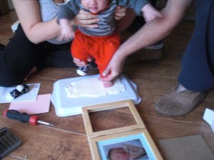 Láb és kéznyomatot vettünk Benjitől. Még a kollegáktól kaptam ajándékba egy készletet ahol egy agyagféleségbe lehet kéznyomatot venni a babáktól és egy fénykép keretbe rögzíteni, de eddig csak halogattuk, vagy annyira fáradtak voltunk, hogy nem volt rá időnk és energiánk, de most hogy itt volt anyu ezt is megejtettük. Elég jól tűrte szegénykém, mert kritikus szemű szüleinek csak a 3. verzió felelt meg, és addig gyúrtuk újra az agyagot még jó nem lett.