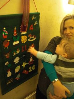 És Jaye néni ilyen szuper adventi naptárt csinált (a sünit, a harangot és a szánkót én varrtam), örök darab lesz. Benji nagyon szereti nézegetni reggelente a méhecskéket rajta és segít kiszedni a reggeli csokikat belőle, amiket önfeláldozóan én eszek meg a nap folyamán.
