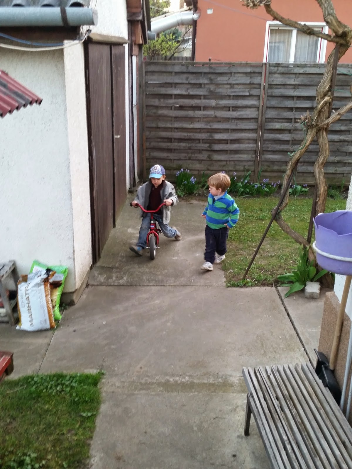 Bicikliben pedig mindketten szuperek. Robin simán megy a nagyobb egyensúlyozós bicajjal, Benjinek pedig kipróbáltuk, hogy megy-e kiskerék nélkül, és szerintem maholnap már menni fog, nagyon ügyes (mondom ezt miután 20x oda-vissza lefutottam vele az utcánkat)