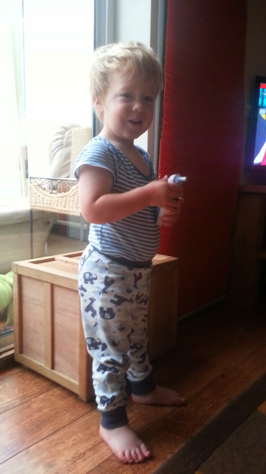 Azért olyan szomorú, hogy már Robin is ilyen nagy, nincs hálózsák, egybe rugi, csak nagyfiús pizsama van (amiből ráadásul a 2-3 évesekre való kicsi rá), amiben nagyfiúsan csibészkedik. És nagyon okos, rengeteg szót tud már, és szinte mindent ismételget.