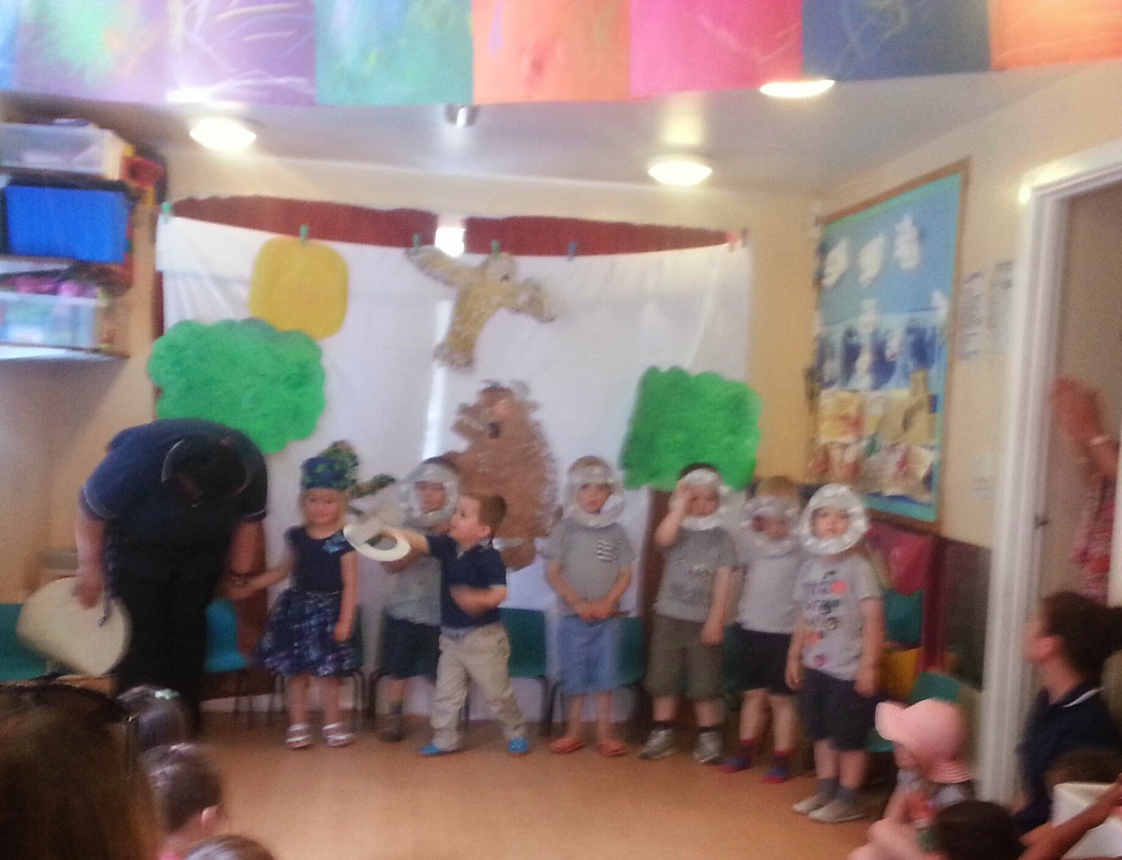 Csináltak egy kis műsort is, a Gruffalót adták elő és egy űrhajósokról szóló éneket. Ő volt az egyik félénk úrhajós. Kicsit el is sírta magát, amikor nagy lelkesen integettem neki, nem akaródzott szerepelnie, de az ovónéni megnyugtatta, én torkomban hatalmas gombóccal bátorítóan mosolyogtam rá, erre ő rám nézett és hangosan mondta, hogy “I love you Mami”. Annyira aranyos volt, hogy egyáltalán nem számított, hogy semmi szöveget nem ismételt és nem akart szerepelni.