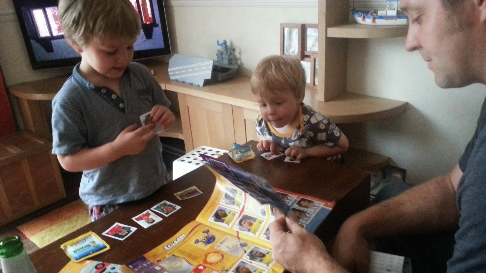 És a legújabb fiú őrület: VB-s focimatrica gyűjtés. Minden este Richard hoz 2-4 csomag matricát, és együtt ragasztják az albumba, Benji olvassa a számokat, Robin adogatja, és mindhárman borzasztó lelkesek, ha összejön egy csapat, vagy csillogó matricát találnak. Már a csere csapat is be van izzítva Oscar és apukája személyében, akik talán még lelkesebbek, náluk az Apukának külön albumja is van..:-)