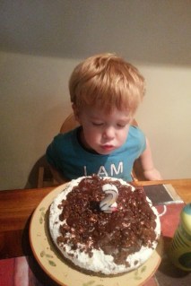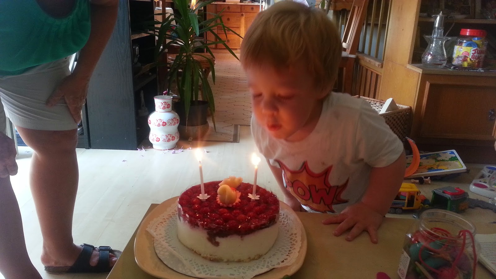 Olyan sok játékot kapott, hogy vacsorázni persze nem volt kedve. Így kedvetlen vacsi után hoztam ki a tortát, amin elfújta a gyertyákat, de enni nem akart belőle, így Benji lenyomott egy szeletet a túró rudi tortából (ami a féltve őrzött túróból készült), tettem volna vissza a hűtőbe, erre az egész torta nem lecsúszott a padlóra?! Menthetetlenül. Placcs. A titkos túró. A álmaimban nyugiban megkóstolt szelet. Mind a padlón.