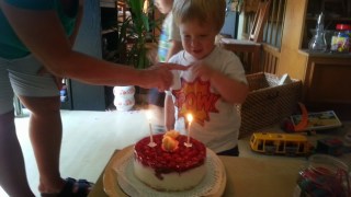 Nagyon még nem fogta fel az alkalom jelentőségét. Reggel amikor felébredt, elénekeltük neki hárman a Happy Birthday-t, ő ránk nézett, kivette a szájából a cumisüveget, és morcosan csak annyit mondott, hogy “No”. Miszerint fejezzük már be. Mostanában sokszor mondja ezt mindenre, ezt a tömör, szemöldök összeráncolós, ellenkezést nem tűrő “No”-t. Nagyon vicces, véletlenül se felejtsük el, hogy ki az úr a háznál. Iszonyat akarata van, eddig nem tapasztalt ellenkezéseket, hisztiket kell kezelnem. Pláne, ha együtt vannak, állandóan összefeszülnek, én meg fáradok az állandó rendcsinálásban.